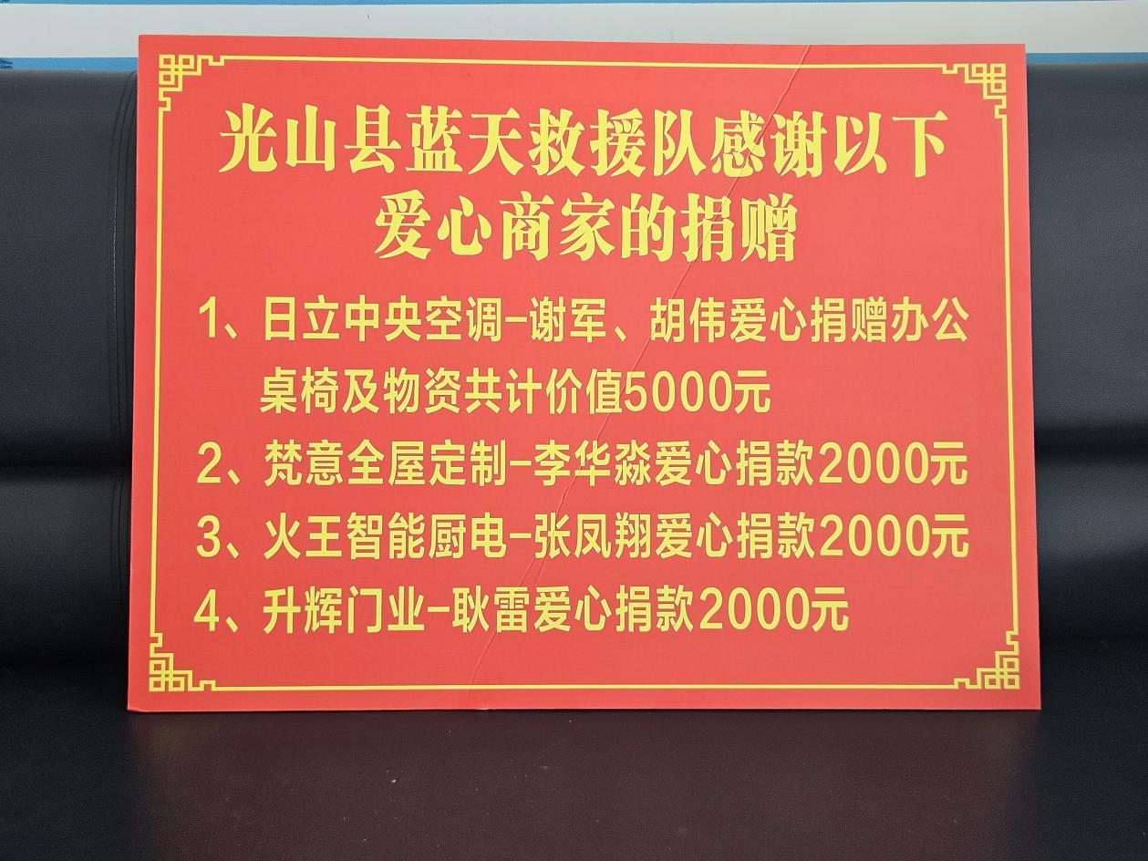 8月16日,光山县蓝天救援队队部洋溢着温暖与感动,一场充满爱心的捐赠活动在此温馨开展。光山县日立中央空调、梵意全屋定制、火王智能厨电、升辉门业四家爱心商家积极响应公益号召,主动履行社会责任,用实际行动传递爱心与正能量,为需要帮助的群体送去了实实在在的关怀与支持。