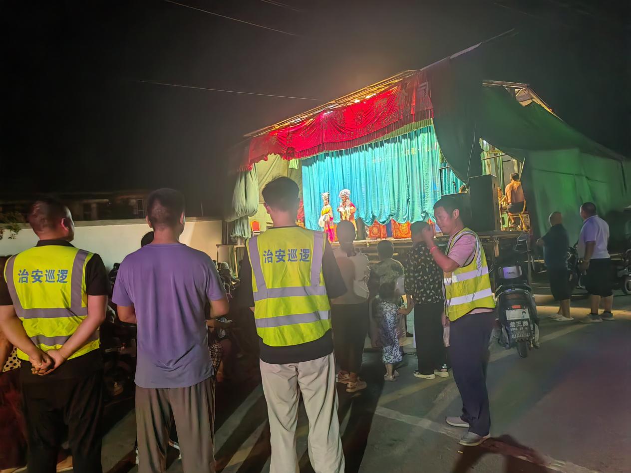 从车来车往的主要道路,到村民聚居的村口小巷,再到商超、卫生院等重点场所,巡逻队始终循着“路路到、村村达、户户访”的节奏细致巡查。遇到晚归的村民,巡逻队员会主动上前叮嘱“锁好门窗、注意安全”;路过沿街商铺,便停下来提醒店主检查消防设施;看到聚集看戏的乡亲,还会特意绕过去,一方面帮忙疏导周边人流、提醒保管好随身物品,另一方面借着热闹劲儿宣讲反电诈、防盗窃、反赌博知识,切实加大法治安全宣传教育力度。