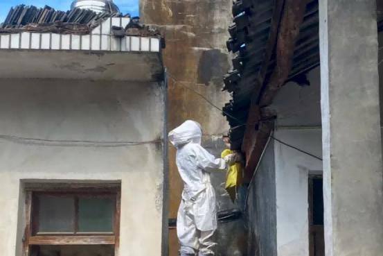 到达现场后,民辅警迅速疏散周边群众,并穿戴专业防护服,利用杀虫剂喷洒和编织袋套取相结合的方式,谨慎靠近、精准操作,最终将马蜂窝成功摘除。随后,民辅警还对蜂窝残留进行了清理,并使用药物对周边部位进行喷洒处理,防止马蜂再次筑巢。
