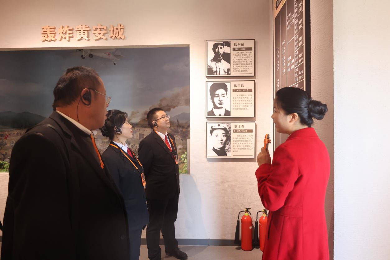 在鄂豫皖苏区首府革命博物馆主展馆,干警们怀着崇敬之心,系统参观了《大别山·红旗不倒》基本陈列。展馆内,一件件饱经战火洗礼的革命文物、一份份泛黄却字迹铿锵的历史文献、一幕幕高度还原的历史场景,共同绘就了鄂豫皖革命根据地从星火初燃到发展壮大,直至红旗二十八载屹立不倒的壮丽史诗。从黄麻起义的惊天枪响,到鄂豫皖苏区的艰难创建;从人民军队的雏形初现,到英雄部队的挥师北上、抗日救国——每一段波澜壮阔的历史篇章,都深深叩击着在场每一位干警的心灵。在镌刻着《中国苏维埃第一次全国代表大会土地法令草案》的展柜前,干警们长久驻足,仔细研读,深切感悟中国共产党在法治建设领域的早期探索与人民立场;面对那面承载着万千民众心声的《永远跟着共产党走》厚重锦幛,大家凝神静思,深刻体悟战争年代党与人民群众生死与共、血脉相连的鱼水深情。