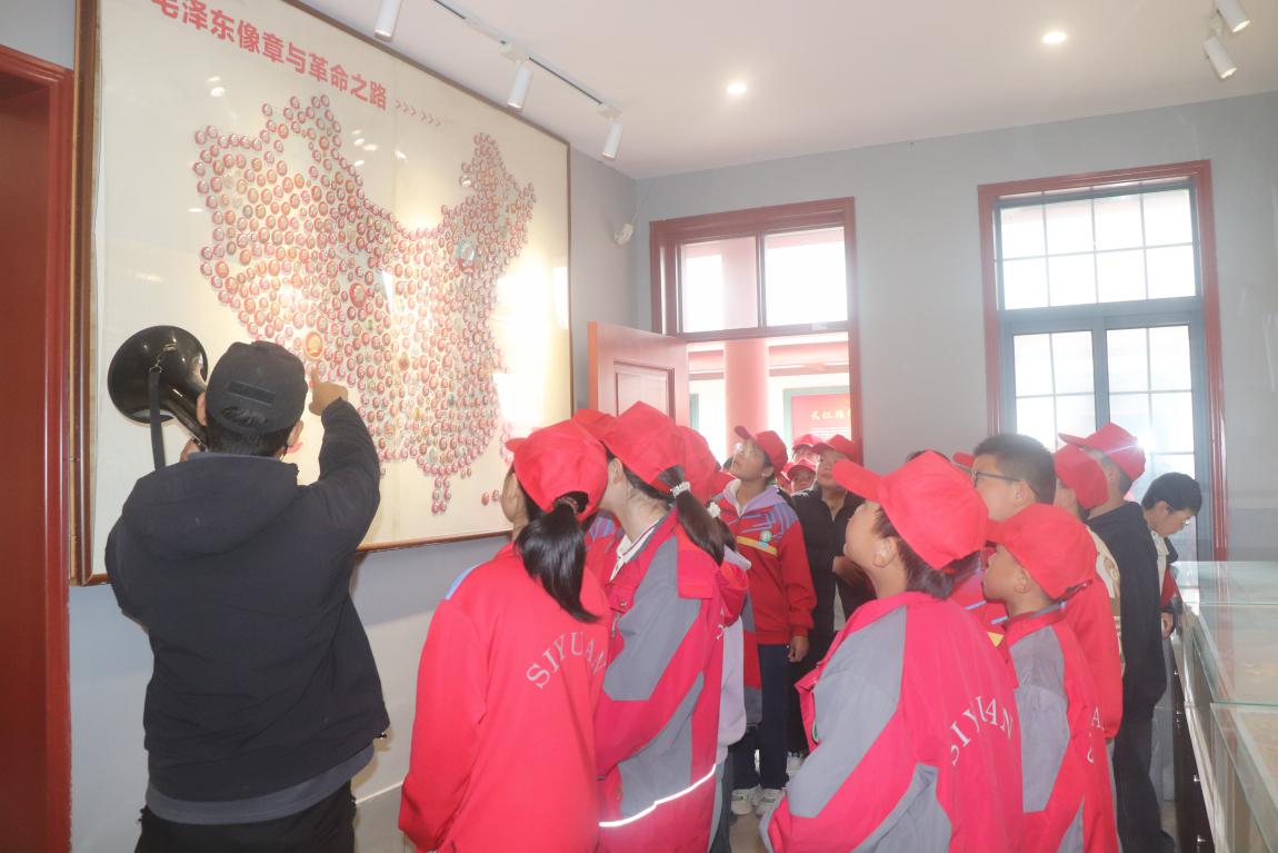 “哇!原来这么多毛主席像章是我们学校翟校长收藏和捐赠的,太了不起了!”在西洋店红色文化传承馆,看着墙上由毛主席像章拼成的“巨幅”中国地图,同学们不由发出阵阵感叹,对思源实验学校副校长翟春峰敬佩不已。传承馆内,一份份泛黄的史料,一件件旧物,一张张照片,一段段文字,让大家瞬间“穿越”到战火纷飞的年代,在“德育”课堂中感悟初心,在革命历史中筑牢信念根基,在本土革命故事中思考“今天的幸福生活从何而来”。