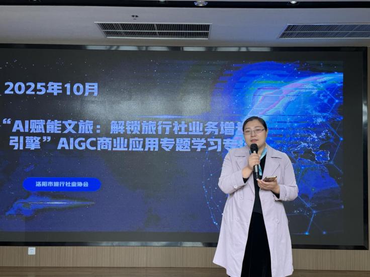 为助力洛阳市旅行社行业把握人工智能发展新机遇,运用AIGC技术提升产品创新、内容创作与客户获客能力,洛阳市旅行社业协会于10月29日上午9点在洛阳市图书馆组织举办了“AIGC商业应用专题学习”活动。55家会员单位代表齐聚一堂,共同探索人工智能技术与文旅行业的深度融合路径。