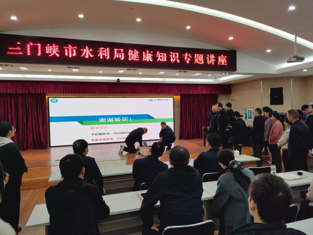 讲座中,三位专家结合水利系统干部职工工作特点,围绕大家高度 关注的健康话题展开讲解。杨松波主任重点普及了急救知识,结合生活和工作中可能遇到的心搏骤停、气管异物梗阻等,通过现场模拟演示,让干部职工详细讲解了心肺复苏操作流程等关键急救方法,提升应对突发健康事件的处置能力。丁韶龙院长则针对水利职工日常工作强度大、久坐办公等情况,从科学运动项目选择、运动强度及运动的重要性、把控及运动损伤预防等方面,进行了深入浅出的讲解,实用性极强,为干部职工在繁忙工作中保持身体健康提供了科学指导。 郎少磊主任聚焦局近两年干部职工体检状况,通过数据对比、案例分析,详细解读了体检中常见指标异常的成因、潜在风险及应对建议,引导大家对自身健康状况形成更清晰的认知,增强健康预警意识。