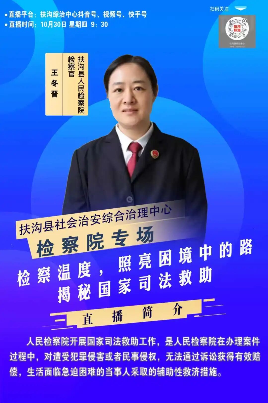 近日,扶沟县人民检察院在县综治中心直播间举办“检察温度,照亮困境中的路——揭秘国家司法救助”专题直播活动,第五检察部控申部门干警王冬晋、呼佳洁担任主讲人,通过政策解读、案例分享等形式,向社会公众全面普及国家司法救助相关知识,切实发挥检察机关化解社会矛盾、救助困境群众的职能作用。